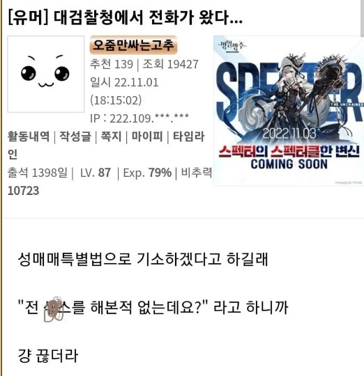 대검찰청에서 전화가 왔다.... 오늘의유머 펀펀뉴스 대검찰청에서 전화가 왔다.... 오늘의유머 펀펀뉴스 설명 아....다행이다.....그런데...왜케 슬프냐... 공유하기 게시글 관리 펀펀블로그 '오늘의유머' 관련 글 더 보기 블라인드 교사 9년차, 기억에 남는 학생들 사장님이 너무 안쓰러워서 눈물흘린 중갤러 공짜 회 3t 쏩니다, 오세요 주식으로 대박 난 사람