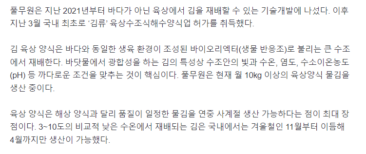 풀무원이 국내 최초로 바다가 아닌 육상에서 이제 재배를 하기 시작함 ㅋㅋ 앞으로 김은 재배라고 불러야 할듯 ㅋㅋㅋ